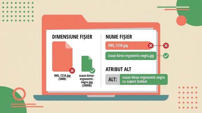 Nu uita de atributul ALT. Acolo poți spune, în câteva cuvinte, ce este în imagine: „scaun birou ergonomic negru cu suport lombar”. Acest atribut ajută motoarele de căutare să înțeleagă imaginea și ajută utilizatorii cu probleme de vedere, care folosesc cititoare de ecran.